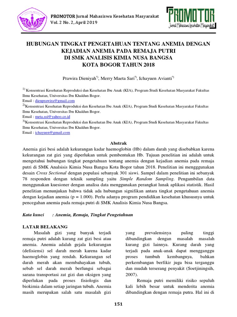 Skripsi faktor faktor merokok pada remaja. Waspada, peringatan dini bmkg hujan lebat di jabodetabek berdampak banjir. Anemia pada remaja pdf 2019. Anemia is a condition when the levels of hemoglobin and erythrocytes are lower than normal. 11 edisi 1, 2019 1 hubungan pengetahuan dan penerapan pesan gizi seimbang pada remaja dalam pencegahan anemia gizi besi agustina, putri permatasari program s1 kesehatan masyarakat, fakultas ilmu kesehatan, universitas pembangunan nasional veteran jakarta abstrak Populasi seluruh remaja putri smp dan sma di kota bengkulu, dengan sampel sebanyak 1200 remaja putri. Dan ternyata, remaja putri memiliki risiko yang lebih tinggi untuk mengalami anemia. Jurnal ilmiah kesehatan masyarakat vol. Hal ini sejalan dengan hasil penelitian gupta et al., (2012) di india yang menunjukkan tidak ada hubungan yang signifikan antara imt terhadap anemia pada 20 jurnal kesmas indonesia, volume 8, nomor 1, januari 2016, hal. Pencegahan dan penyelesaian masalah anemia pada remaja di smp x kota depok jawa barat. Peningkatan itu, katanya, dipengaruhi oleh adanya defisiensi zat besi atau berkurangnya zat besi dalam darah karena kebutuhan yang cukup tinggi pada saat hamil. Hari gizi nasional 2021 menyoroti anemia pada remaja wanita dan stunting pada anak. Anggota yonif 700/wcy berhasil amankan satu orang diduga anggota opm.